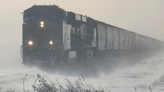 Snow way we were going to leave this one out! During a January blizzard, a grain shuttle makes its way back to Crookston, Minnesota, from Beltrami, Minnesota.